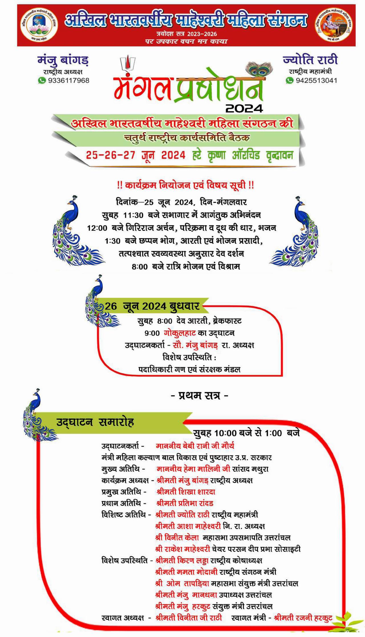 22-Jun - राष्ट्रीय महिला संगठन की त्रयोदश सत्र की चतुर्थ राष्ट्रीय कार्य समिति बैठक मंगल प्रबोधन 2024 का 25-26-27 जून को वृंदावन मे भव्य आयोजन