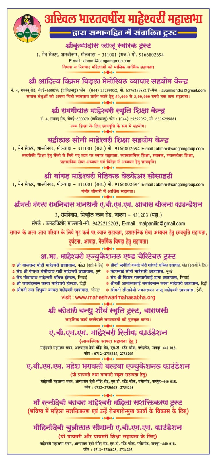 25-May - अखिल भारतीय माहेश्वरी महासभा द्वारा संचालित विभिन्न ट्रस्टों की जानकारी