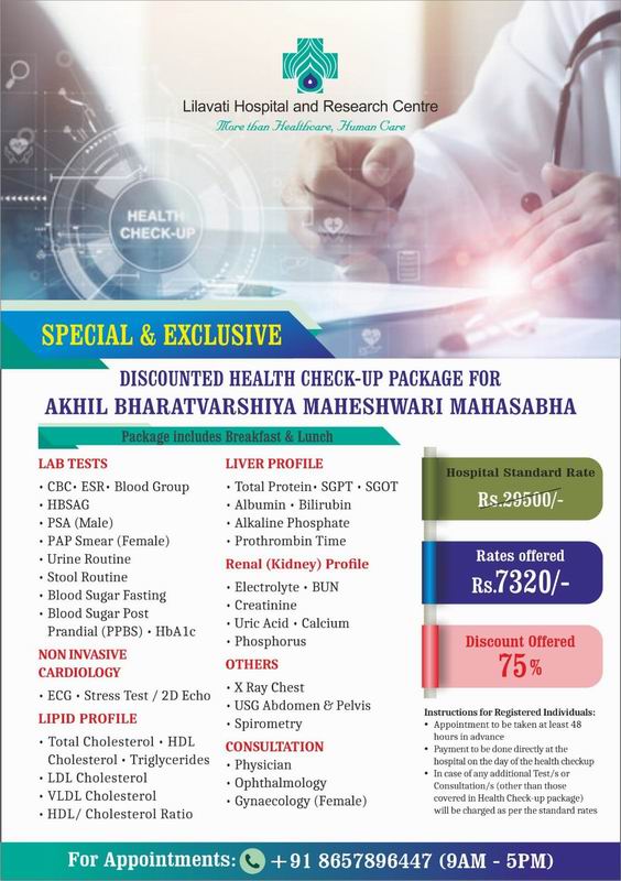 11-Jul - अखिल भारत वर्षीय माहेश्वरी महासभा द्वारा हेल्थ चेक-अप डिस्काउंट रेट पर उपलब्ध