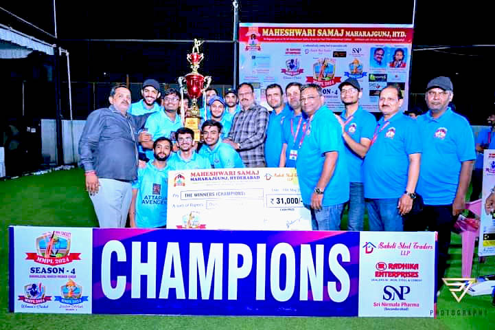 माहेश्वरी समाज महाराजगंज हैदराबाद द्वारा आयोजित MMPL2024 क्रिकेट प्रतियोगिता में नगर के विभिन्न क्षेत्रों से युवा, महिला एवं बाल वर्ग (जूनियर) का अलग अलग टूर्नामेंट आयोजन किया गया जिसमे युवा वर्ग में अत्तापुर एवनेजर्स विजय रही, सबसे आकर्षित रही महिला एवं बाल वर्ग (जूनियर) वर्ग की प्रतियोगिता महिला वर्ग की विजेता रही। सिकंदरबाद क्षेत्र की लेडी पेंथर्स टीम एवं जूनियर क्रिकेट से विजेता रही मोटू पतलू चैम्प्स। प्रेस विज्ञप्ति से बात करते हुए अध्यक्ष रामदेव सारड़ा ने कहा महिला वर्ग से शहर के विभिन्न क्षेत्रो से चार टीमों के 7 मैचों की इस श्रंखला में 4 लीग, 2 सेमी फाइनल एवं फाइनल मैच में कबूतर खाना क्षेत्र की थंडर क्वीन के 7 ओवरों में 6 विकेट के नुकसान पर 25 रनो के लक्ष्य को लेडी पेंथर्स ने मात्र 6 ओवरों में 3 विकेट के नुकसान पर खिलाड़ी राधे राठी के 15 रनो की बदौलत 30 रनो को प्राप्त कर विजय पताका लहराया।