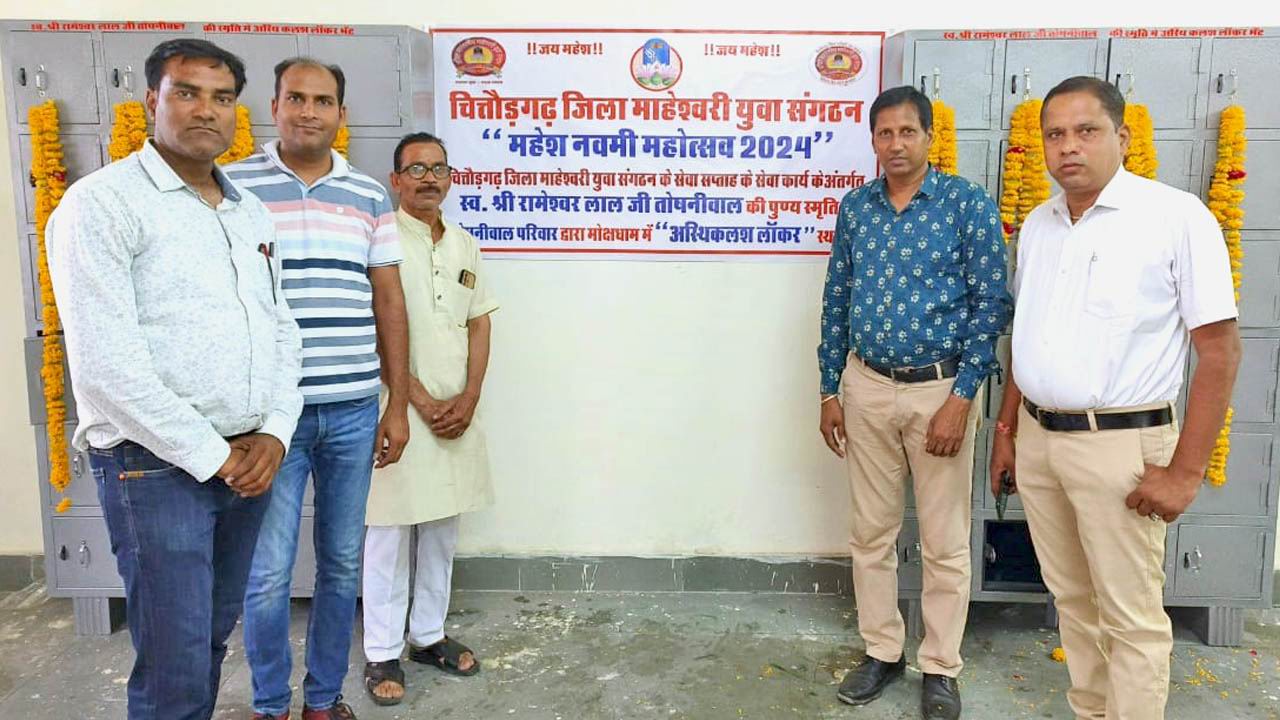माहेश्वरी समाज के स्थापना दिवस महेश नवमी के शुभ अवसर पर चित्तौडग़ढ़ जिला माहेश्वरी युवा संगठन द्वारा मनाये जा रहे सेवा पखवाड़ा के तहत शहर के तोषनीवाल परिवार द्वारा जिला माहेश्वरी युवा संगठन के तत्वाधान में सिटी मोक्षधाम मे अस्थि कलश सुरक्षित रखने हेतु 48 अस्थि कलश लॉकर मोक्षधाम समिति को सौंप गए। यह जानकारी देते हुए चित्तौडग़ढ़ जिला माहेश्वरी युवा संगठन के जिला अध्यक्ष लोकेश समदानी ने बताया कि शहर में स्थित सिटी मोक्षधाम में काफी समय से अज्ञात शवो की अस्थियां एवं निजी कारणों से जो परिजन अस्थियां घर पर नहीं ले जाते है उनके लिए अस्थियों के कलश को सुरक्षित रखना के लिए लोकर की आवश्यकता हो रही थी। इस पर जिला माहेश्वरी युवा संगठन के प्रयासों से शहर के तोषनीवाल परिवार ने पूर्व बैंक कर्मी स्वर्गीय श्री रामेश्वर लाल तोषनीवाल की स्मृति में 48 लॉकर तैयार कर मोक्षधाम समिति शहर को सुपुर्द किया गए जिनका रख रखाव एवं संचालन मोक्षधाम शहर समिति द्वारा किया जाएगा।