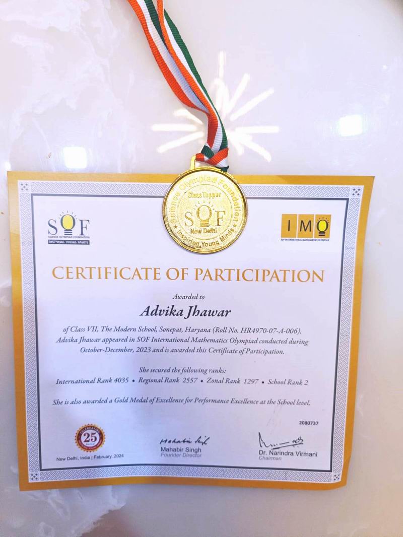 दिल्ली निवासी सुप्रसिद्ध समाजसेवी श्री माणकलाल झंवर एवं श्रीमती उमा देवी झंवर (पूर्व अध्यक्षा दिल्ली प्रदेश माहेश्वरी महिला संगठन) की सुपौत्री तथा श्री आदित्य-आंकाक्षा झंवर की सुपुत्री कुमारी अद़विका झंवर ने सांइस ओल्म्पीयाड फाउन्डेशन द्वारा आयोजित इन्टरनेशनल मेथामेटिक ओल्म्पीयाड में स्कूल स्तर पर द्वितीय स्थान हासिल कर स्वर्ण पदक प्राप्त किया है। मॉडल स्कूल दिल्ली की कक्षा 7 की छात्रा अद्विका ने इस प्रतियोगिता में इन्टरनेशनल स्तर पर 4035 वां, रिजनल स्तर पर 2557 वां तथा जोनल स्तर पर 1297वां स्थान हासिल किया है। माहेश्वरी सेवक पत्रिका परिवार कुमारी अद्विका की इस शानदार उपलब्धि के लिये उसका हार्दिक अभिनन्दन करते हुए उसके उज्जवल भविष्य की मंगल कामना करता है।