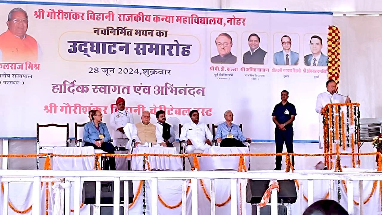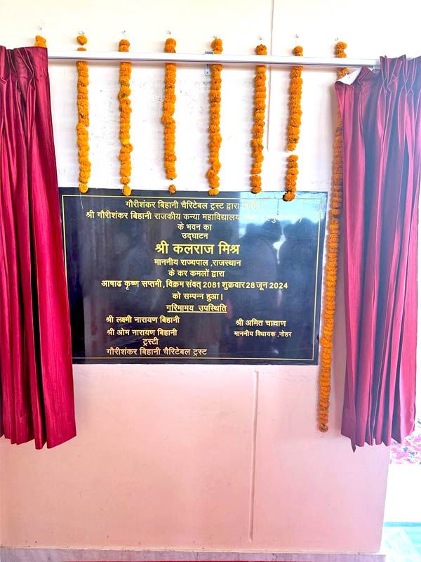 नोहर में श्री गौरीशंकर बिहाणी राजकीय कन्या महाविद्यालय का उद्घाटन 28 जून 2024 को राजस्थान के राज्यपाल कलराज मित्र ने किया। इस महाविद्यालय का निर्माण गोरीशंकर बिहाणी चैरिटेबल ट्रस्ट द्वारा करवाया गया है। महाविद्यालय के निर्माण पर करीब 6 करोड़ रुपये खर्च हुये है। इस मौके पर आयोजित समारोह में पूर्व शिक्षा मंत्री डॉ. बी.डी. कल्ला, नोहर विधायक अमित चाचाण, भामाशाह लक्ष्मीनारायण बिहाणी, ओमनारायण बिहाणी आदि मंच पर उपस्थित थे। राज्यपाल के नोहर पहुंचने पर जनप्रतिनिधियों के अलावा बिहाणी परिवार द्वारा स्वागत किया गया। समारोह में सर्वप्रथम राज्यपाल कलराज मिश्र ने संविधान की प्रस्तावना व संविधान में दिये गये कर्तव्यों का वाचन किया। समारोह में विचार व्यक्त करते हुये राज्यपाल कलराज मिश्र ने कहा कि समाज व देश के विकास का प्रमुख आधार ही शिक्षा है। शिक्षा के माध्यम से परिवर्तन की बयार लाई जा सकती है। राज्यपाल ने बिहाणी परिवार को साधुवाद देते हुये कहा कि बिहाणी परिवार ने शिक्षा के साथ साथ प्रत्येक क्षेत्र में विकास के कार्य करवाकर अनुकरणीय कार्य किये है। उन्होंने कहा कि जन्मभूमि स्वर्ग से भी श्रेष्ठ होती है। यह बात बिहाणी परिवार की जन्मभूमि के प्रति लगाव से सिद्ध होती है। बिहाणी परिवार द्वारा बनाये गये महाविद्यालय से क्षेत्र की बालिकाओं को उच्च शिक्षा ग्रहण करने में सुविधा होगी। पूर्व मंत्री डॉ. बी.डी. कल्ला ने कहा कि नोहर में बिहाणी परिवार द्वारा बनाया गया महाविद्यालय बालिकाओं को उच्च शिक्षा ग्रहण करने का मार्ग प्रशस्त करेगा। डॉ. बी.डी. कल्ला ने सेठ गौरीशंकर बिहाणी को त्याग व दान की प्रतिमूर्ति बताते हुये कहा कि उन्होंने जन्मभूमि नोहर से लगाव कभी कम नहीं होने दिया। उनकी सोच थी कि महिलाए आर्थिक व शैक्षिक रूप से सम्पन होने से ही देश व समाज आगे बढ़ेगा। विधायक अमित चाचाण ने कहा कि बिहाणी परिवार के बगैर नोहर का विकास अधूरा है। उन्होंने दशको पूर्व ही क्षेत्र में मूलभूत सुविधाए उपलब्ध करवाई थी। बिहाणी परिवार ने ऐसा कोई क्षेत्र नहीं जिसमें विकास कार्य न करवाये ही। क्षेत्र में विकास कार्यों में बिहाणी परिवार द्वारा दिया गया योगदान हमेशा चिरस्थायी रहेगा। भामाशाह ओमनारायण बिहाणी ने कहा कि उनके पिता गौरीशंकर बिहाणी ने पूरे परिवार को जो संस्कार दिये थे उनका परिणाम है कि उनके द्वारा शुरू कि गई विकास की यात्रा अनवरत जारी है। उन्होंने कहा कि उनके पिता का मानना था कि शिक्षा के बिना जीवन अधूरा है। उन्होंने सदैव साधा जीवन उच्च विचार को महत्व दिया। ओमनारायण बिहाणी ने कहा कि शिक्षा रूपी ज्ञान समाज व देश को कमजोर नहीं होने देता। विकास का प्रमुख आधार ही शिक्षा है। उन्होंने नोहर क्षेत्रवासि