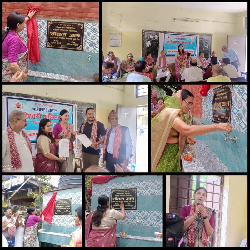 माहेश्वरी महिला मंच विराट नगर द्वारा जनता नमूना विद्यालय दुर्गा चौक में WATER CHILLING PLANT हस्तांतरण किया गया। प्रमुख अतिथि विराटनगर महानगरपालिका के उपमेयर शिल्पा निराला कार्की द्वारा water filter and chilling plant का उद्घाटन किया गया। इस कार्यक्रम में वडा अध्यक्ष श्री कुमार पोखरेल, माहेश्वरी समाज विराटनगर के अध्यक्ष श्री घनश्याम काबरा, अखिल भारतवर्षीय माहेश्वरी महिला संगठन पूर्वांचल उपाध्यक्ष श्रीमती गिरिजा शारदा, अखिल भारतवर्षीय माहेश्वरी महिला संगठन पूर्वांचल संजीवन सिद्धा सह प्रभारी अर्चना तापडिय़ा, नेपाल माहेश्वरी महिला संगठन की उपाध्यक्ष श्रीमती अमिता पेड़ीवाल, नेपाल माहेश्वरी महिला संगठन ग्राम विकास समिति सह प्रभारी कल्पना राठी, माहेश्वरी महिला मंच की संस्थापक अध्यक्ष श्रीमती गोमती राठी, अखिल भारतवर्सीय माहेश्वरी परिषद कार्यकारिणी मंडल सदस्य श्री बजरंग बाहेती, नेपाल माहेश्वरी परिषद का उपाध्यक्ष श्री आनंद जाजू, अखिल भारतवर्षीय माहेश्वरी युवा संगठन पूर्वांचल संयुक्त मंत्री श्री विवेक राठी, निवर्तमान अध्यक्ष संतोष बाहेती, पूर्व अध्यक्ष संतोष राठी, जनता माद्यमिक विद्यालय के अध्यक्ष मनोज विक्रम शाह एवं प्रिंसिपल की उपस्थिति थी। मंच की बहनों की सराहनीय उपस्थिति रही।
