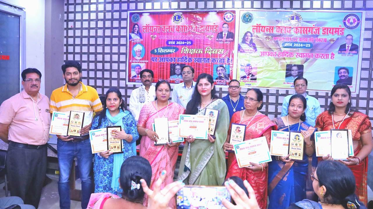 लायंस क्लब कासगंज डायमंड द्वारा दिनांक 15 सितंबर 2024 को शिक्षकों के सम्मान में होटल जे.डी. मराठा, नदरई गेट कासगंज में एक कार्यक्रम आयोजित किया गया जिसमें श्रीमती सुमन लता चौहान, श्रीमती संगीता माहेश्वरी, श्रीमती छाया माहेश्वरी, श्रीमती दीप्ति अग्रवाल, श्रीमती प्रदीपिका सिंह, श्रीमती स्वीटी शर्मा, श्रीमती अंजलि जाजू और श्री अनुज कुमार को उनके द्वारा शिक्षा क्षेत्र में किए गए कार्यों के लिए सम्मानित किया गया।