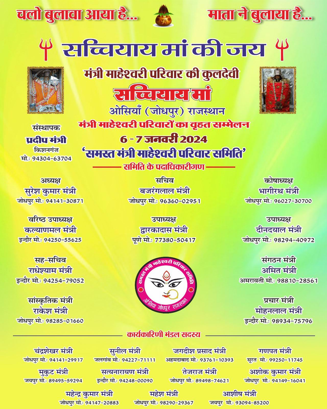 समस्त मंत्री परिवार समिति द्वारा 'मंत्री परिवार महाकुंभ' का आयोजन दिनांक 6-7 जनवरी 2024 को ओसियां जोधपुर (राज.) में आयोजित किया जा रहा है।