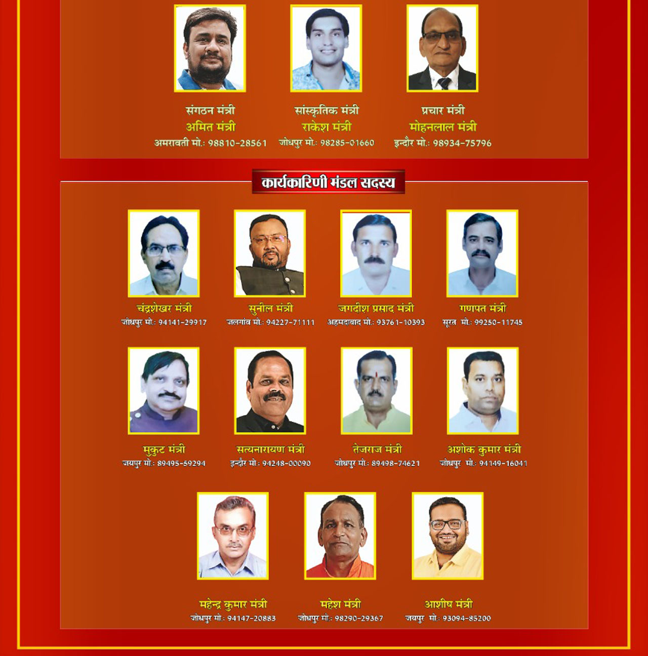 ओसियां के अंतराराष्ट्रीय आवास भवन के प्रांगण में समस्त मंत्री माहेश्वरी परिवार समिति का गठन किया गया, जिसमें पदाधिकारियों व कार्यसमिति के सदस्यों का निर्विरोध चयन हुआ। समिति में सर्व श्री प्रदीप मंत्री किशनगंज (बिहार) को संस्थापक अध्यक्ष मनोनित किया गया तथा अध्यक्ष पद पर सर्वश्री सुरेश कुमार मंत्री, सचिव बजरंगलाल मंत्री, कोषाध्यक्ष भागीरथ मंत्री जोधपुर, वरिष्ठ उपाध्यक्ष कल्याणमल मंत्री इंदौर, उपाध्यक्ष द्वारकादास मंत्री पुणे, उपाध्यक्ष दीनदयाल मंत्री जोधपुर, सह-सचिव राधेश्याम मंत्री इंदौर, संगठन मंत्री अमित मंत्री अमरावती, सांस्कृतिक मंत्री राकेश मंत्री जोधपुर एवं प्रचार मंत्री मोहनलाल मंत्री इंदौर का चयन हुआ। इसके अलावा कार्यकारिणी मंडल सदस्य के रूप में सर्वश्री चन्द्रशेखर मंत्री जोधपुर, सुनील मंत्री, जलगांव, जगदीश मंत्री अहमदाबाद, गणपत मंत्री सूरत, मुकुट मंत्री जयपुर, सत्यनारायण मंत्री इंदौर, तेजराज मंत्री, अशोक मंत्री, महेन्द्रकुमार मंत्री, महेश मंत्री जोधपुर आदि को मनोनित किया गया। चुनाव प्रक्रिया में सभी प्रदेशों के मंत्री परिवार सदस्य की उपस्थिति में यह प्रक्रिया संपन्न हुई। समिति के गठन के पश्चात सभी ने स्वागत और शुभकामनाएं एवं बधाई दी तथा आभार प्रचार मंत्री मोहनलाल मंत्री ने प्रकट किया।