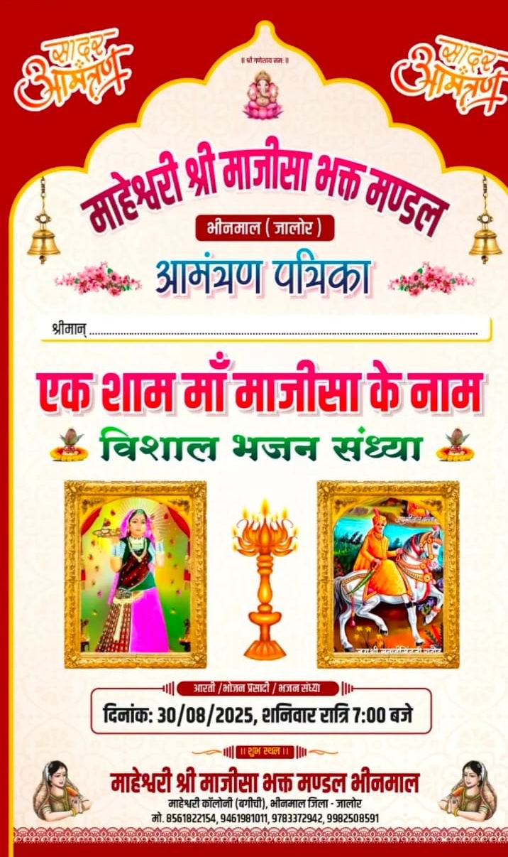 जालौर जिले के भीनमाल शहर में माजीसा माहेश्वरी मित्र मंडल के द्वारा हर साल की विशाल भजन 30 अगस्त 2025 शनिवार को माजीसा के जन्मोत्सव की दिन एक शाम माजीसा के नाम विशाल भजन संध्या का आयोजन माहेश्वरी कॉलोनी भीनमाल में रखा गया। इसमें जाने माने गायक कलाकार खुशबू कुमुट एंड पार्टी जोधपुर, चांदमल गुर्जर एंड पार्टी मकराना द्वारा सुन्दर भजनों की प्रस्तुति दी जाएगी और कुणाल राज एंड पार्टी दिल्ली के द्वारा सुंदर झाकियों का भी कार्यक्रम होगा। इसमें राजस्थान ,गुजरात के अलग अलग शहरों के समाज बन्धु, माजीसा के भगत भाग लेने आ रहे हैं।
