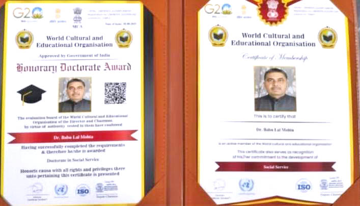 श्री बाबू लाल मोहता, बीकानेर डॉक्टरेट की मानद उपाधि से अलंकृत