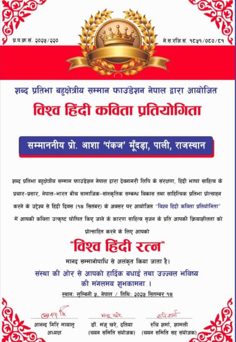 पाली की ख्याति प्राप्त कवयित्री तथा वरिष्ठ साहित्यकार प्रो. आशा पंकज मूँदडा को विश्व स्तर पर हिंदी दिवस पर सम्मानित किया गया है। नेपाल की प्रसिद्ध संस्था शब्द प्रतिभा बहुक्षेत्रीय सम्मान फाउन्डेशन नेपाल द्वारा हिंदी दिवस के संदर्भ में आयोजित विश्व हिंदी कविता प्रतियोगिता में उत्कृष्ट कविता के आधार पर प्रो.आशा पंकज मूँदडा को विश्व हिंदी रत्न मानद उपाधि सम्मान से प्रशस्ति पत्र प्रदान कर सम्मानित किया गया है। ज्ञात हो कि प्रो.आशा पंकज मूँदडा पाली राजकीय बांगड़ महाविद्यालय में सहायक प्रोफेसर के पद पर सेवाएं दे रही हैं। इनकी सैकड़ों रचनाएं देश- विदेश की विभिन्न पत्र-पत्रिकाओं में एवं सांझा संकलनों में प्रकाशित हो चुकी है तथा साहित्य के क्षेत्र में उल्लेखनीय योगदान के लिए दर्जनों प्रतिष्ठित सम्मान भी मिल चुके हैं।