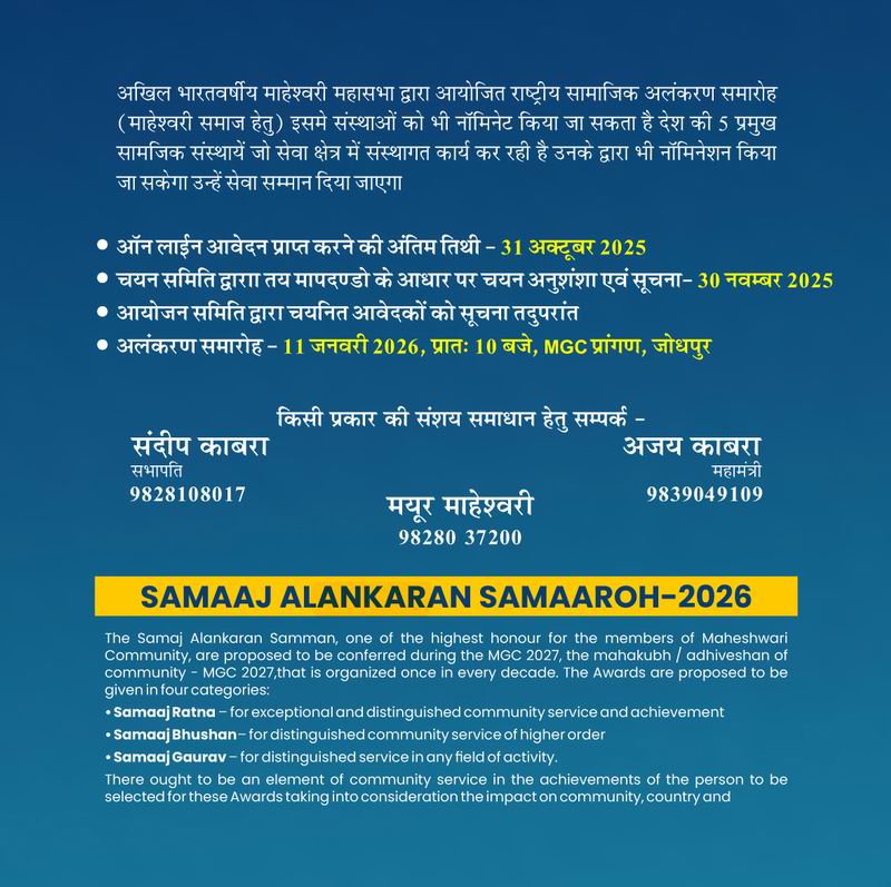 आगामी 9,10,11 जनवरी को अपने माहेश्वरी समाज का सबसे बड़ा सामजिक पर्व - माहेश्वरी महाकुंभ का आयोजन जोधपुर, राजस्थान में आयोजित होने जा रहा है। इस आयोजन में देश विदेश के अनेकों समाज बंधु भाग लेने वाले है तथा आशा है आप सब ने भी अपना अपेक्षित पंजीकरण करवा लिया होगा। महासभा द्वारा आयोजित इस महाकुंभ में समाज के देश विदेश में रह रहे हमारे समाज बंधुओं को, जिन्होंने देश विदेश में अपने परिश्रम, सेवा एवं समर्पण के जज़्बे द्वारा देश दुनिया मे किसी विशेष उपलब्धि तथा मुकाम को हासिल किया है एवं अपने कार्य क्षेत्र में विशेष पहचान बनाई है, ऐसे समाज जनों का इस सामाजिक महाकुंभ एमपीसी 2026 में अलंकरण समारोह में सम्मान किया जावे, ऐसा आयोजन समिति द्वारा तय किया गया हैं। इस हेतु यह तय किया गया है कि हमारे समाज के उन बंधुओं द्वारा या तो स्वयं अपने आप को नामांकित किया जा सकता है अथवा यदि ऐसी प्रतिभा हमारे क्षेत्र में है एवं हमें ऐसा लगता है कि उनके कार्य एवं व्यक्तित्व का इस दृष्टिकोण से संपर्र्क नही हो पाया है तो हमारे सामाजिक संगठनों द्वारा या कार्यकर्ता द्वारा भी नामांकन प्रेषित किया जा सकता हैं। सारी प्रक्रिया आन लाइन रहेगी नामांकन पत्र भरने से लेकर उसके चयन एवं प्रतिभागियों को सूचना तक, सब आन लाइन रहेगा। किस आवेदक को सामाजिक अलंकरण समारोह में चयनित किया जाएगा इस हेतु देश के विभिन्न क्षेत्रों में सर्वोच्च पदों अपनी सेवाएं देने वाले हमारे पूर्व न्यायाधीश एव प्रशासनिक अधिकारियों की एक उच्च स्तरीय ज्यूरी (चयन समिति) बनाई गई है। हम अपने क्षेत्र तथा अपनी जानकरी में हमारी बहुआयामी सामाजिक प्रतिभाओ को संपर्क करें, उन्हें नामांकित करें अथवा उनसे नामांकन करावें, आपसे यह अपेक्षा है। यह विशेष ध्यान करें कि ऑनलाइन आवेदन की प्रक्रिया की अंतिम तिथि दिनाँक 31 अक्टूबर तक रहेगी। उसके बाद चयन समिति सभी आवेदनों की जांच कर अपना निर्णय देगी। समिति द्वारा प्राप्त निर्णय के अनुसार सूचना सभी चयनित आवेदकों को दी जाएगी एवं दिनांक 11 जनवरी 2026 को उन्हें महाकुंभ के मंच पर अलंकृत कर हम अपना सम्मान उनके प्रति व्यक्त करेंगे। सभी नियमावली संलग्न ब्रॉशर में सम्मिलित है। पूर्ण पारदर्शिता के साथ निर्पेक्ष भाव से हम इस कार्य को संपादित कर समाज की प्रतिभाओं का सम्मान कर स्वयं को सम्मानित अनुभव करेंगे। हम सब मिलेंगे आगामी महाकुंभ 2026 जनवरी में इस आशा एव विश्वास के साथ। आदि शक्ति माँ दुर्गा हम सब के लिये मंगल करे जय माँ चामुंडा।