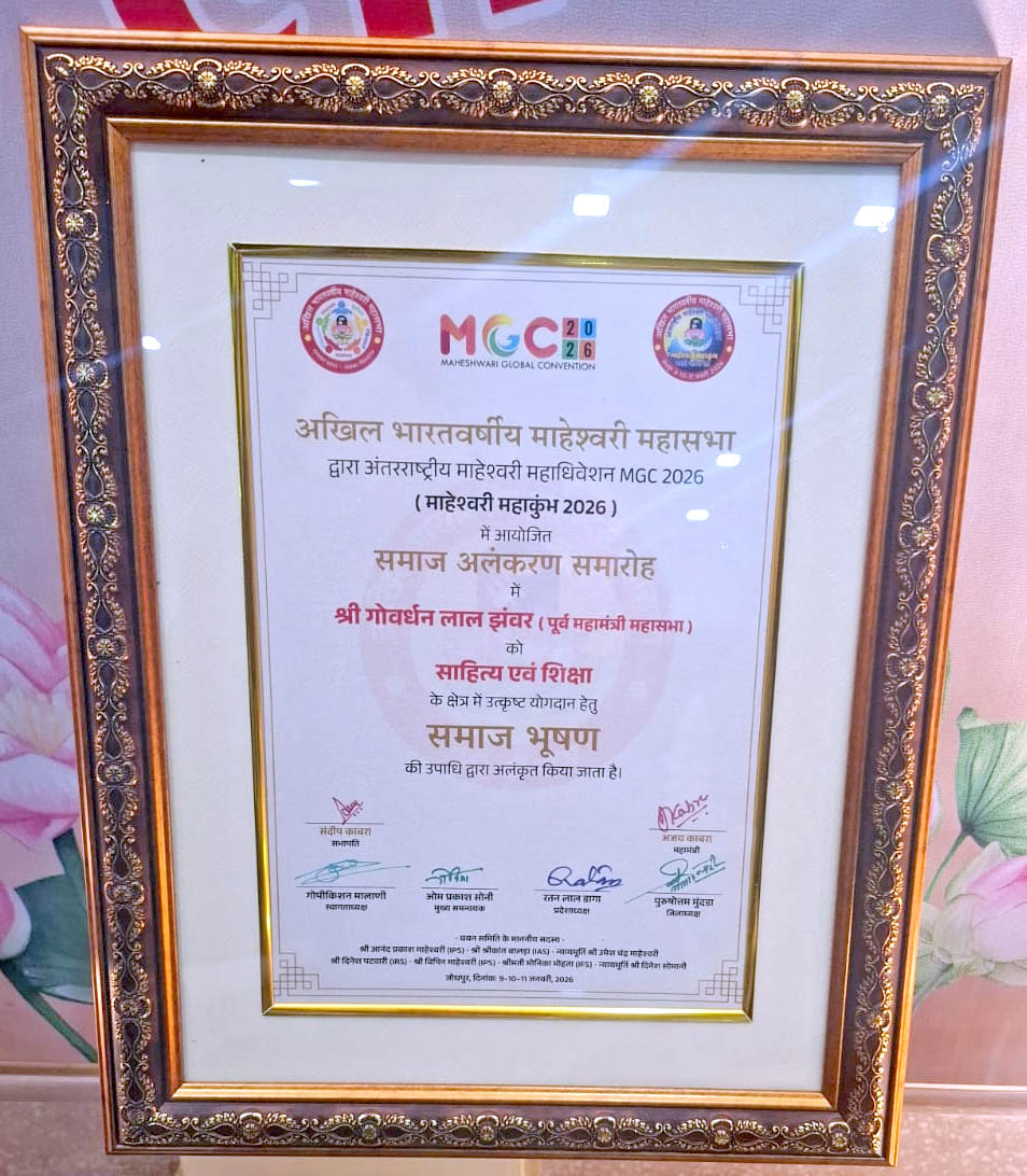 जोधपुर अधिवेशन में 9,10,11 जनवरी 2026 को आयोजित अखिल भारतीय माहेश्वरी ग्लोबल कन्वेंशन में वाराणसी के श्री गोवर्धन लाल झंवर को समाज भूषण से सम्मानित किया गया। श्री गोवर्धन लाल झंवर का सम्मान उनके पुत्र अनिल झंवर ने जोधपुर में राजस्थान के राज्यपाल के हाथों से लिया चूंकि स्वास्थ की वजह से गोवर्धन लाल जोधपुर नहीं पहुंच पाए थे और महासभा का प्रयास था कि झंवर जी का सम्मान उनके घर पर करे। अत: उनका सम्मान वाराणसी में एक फरवरी 2026 को अखिल भारतीय माहेश्वरी महासभा के महामंत्री श्री अजय काबरा, श्री कोठारी बंधु शौर्य स्मृति ट्रस्ट के अध्यक्ष एवं कार्यकारी मंडल सदस्य लोकेंद्र करवा व समाज के वरिष्ठजनो भंवरलाल राठी, श्रीराम चितलांगिया, श्री गौरीशंकर नेवर, श्री मांगीलाल सारडा, श्री राजकुमार कोठारी, श्री दीपक दूजारी, श्री बृजमोहन मूंदड़ा, कैलाश राठी, श्री रामलाल चांडक, श्री किशोर मूंदड़ा, कविता मारु, कुमुद चांडक, राकेश कचोलिया के अलावा समाज के 75 लोगों की उपस्थिति में हुआ, सम्मान समारोह में भंवरलाल राठी, श्रीराम चितलांगिया, गौरीशंकर नेवर, राकेश दरक ने श्री झंवर के बारे में विचार व्यक्त किए। संचालन लोकेंद्र करवा ने किया।