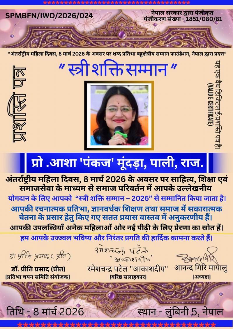 लुंबिनी (नेपाल), 8 मार्च। अंतर्राष्ट्रीय महिला दिवस के अवसर पर पाली (राजस्थान) की कवयित्री एवं सहायक आचार्य प्रो. आशा 'पंकज' मूंदड़ा को नेपाल में स्त्री शक्ति सम्मान से सम्मानित किया गया। यह सम्मान शब्द प्रतिभा बहुक्षेत्रीय सम्मान फाउंडेशन, नेपाल द्वारा आयोजित कार्यक्रम में प्रदान किया गया।