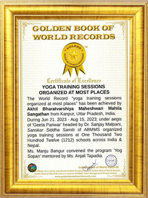 "फिट इंडिया ही हिट इंडिया है" की विचारधारा रखते हुए अखिल भारतवर्षीय माहेश्वरी महिला संगठन की संस्कार सिद्ध समिति द्वारा एवं गीता परिवार के सानिध्य में योग प्रशिक्षण शिविरों का आयोजन किया गया। विश्व योग दिवस दिनांक 21 जून 2023 से स्वतंत्रता दिवस 15 अगस्त 2023 तक अखिल भारतवर्षीय माहेश्वरी महिला संगठन की राष्ट्रीय अध्यक्ष श्रीमती मंजु बांगड एवं श्रीमती अंजली तापडिया के मार्गदर्शन भारत एवं नेपाल के 1212 स्कूलों में योग सोपान कार्यक्रम के अंतर्गत योग प्रशिक्षण शिविरों का आयोजन किया गया। योग प्रशिक्षण शिविरों सम्पूर्ण आयोजन गीता परिवार के डॉ. संजय मालपानी के सानिध्य में संपन्न किया गया। एक ही समयावधि में सर्वाधिक स्कूलों में योग प्रशिक्षण शिविरों के आयोजन किये जाने पर योग सोपान कार्यक्रम को गोल्डन बुक ऑफ़ वर्ल्ड रिकार्ड्स में "Yoga Training Sessions Organized at Most Places" के शीर्षक के साथ वर्ल्ड रिकॉर्ड के रूप में दर्ज किया गया। वर्ल्ड रिकॉर्ड का सर्टिफिकेट गोल्डन बुक ऑफ़ वर्ल्ड रिकॉर्ड के एशिया हेड डॉ. मनीष विश्नोई एवं प्रतिनिधि श्री मनोज कुमार शुक्ला द्वारा साँची मध्यप्रदेश में आयोजित अखिल भारतवर्षीय माहेश्वरी महिला संगठन त्रयोदश सत्र की द्वितीय कार्यसमिति व प्रथम कार्यकारी सत्र की बैठक हेतु आयोजित कार्यक्रम कौशलेन्द्रम 2023 के दौरान मुख्य अतिथि श्री विपिन माहेश्वरी (DGP, MP Special Crime Branch) एवं सभापति श्री संदीप काबरा, विशेष अतिथि राष्ट्रीय महामंत्री श्री अजय काबरा, उपसभापति मध्यांचल श्री विजय राठी, संयुक्त मंत्री मध्यांचल श्री दिनेश राठी एवं प्रदेश अध्यक्ष श्री अतुल माहेश्वरी, अ. भा. माहेश्वरी महिला संगठन के अन्य पदाधिकारियों की उपस्थिति में ABMMS की राष्ट्रीय अध्यक्ष श्रीमती मंजु बांगड को प्रदान किया। योग सोपान कार्यक्रम के अंतर्गत आयोजित योग प्रशिक्षण शिविरों के विषय में जानकारी देते हुए गीता परिवार की श्रीमती अंजलि तापड़िया ने बताया कि लगभग 1500 योग प्रशिक्षकों का प्रशिक्षण विश्व योग दिवस से एक माह पूर्व से ही प्रारम्भ किया जा चुका था, ताकी योग सोपान कार्यक्रम के दौरान सभी शिविरों में प्रशिक्षण कार्य सुगमता से संपन्न हो सके।