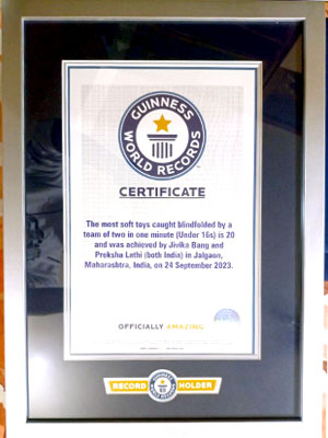 कु.जीविका आनंद बंग (उम्र 11 साल) और कु. प्रेक्षा योगेश लाठी (उम्र 15 साल) ने पिछले ही वर्ष स्थापित हुए इंग्लेण्ड के जैक डेन और राफा डेन के रिकॉर्ड को तोड़कर एक नया कीर्तिमान बनाया। इस रिकॉर्ड में जीविका की आँखो पर पट्टी बांधकर सॉफ्ट टॉईज कैच करना था। जो की दुसरी तरफ प्रेक्षा 10 फिट की दुरी से उसके तरफ फेकने वाली थी। अंतिम प्रयास में जीविका ने कुल 28 सॉफ्ट टॉईज कैच किए। गिनीज बुक ऑफ वल्र्ड रिकॉर्ड के नियमानुसार कुल 20 की गिनती हुई जो की गत कीर्तिमान से 5 ज्यादा है।