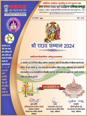 राज रचना एवं कला साहित्य परिषद रायपुर (छत्तीसगढ़) द्वारा विश्व प्रसिद्ध अयोध्या में आयोजित श्री राम प्रतिष्ठा के शुभ अवसर पर जोधपुर की कवियत्री स्वाति सरु जैसलमेरिया को श्री राघव सम्मान 2024 से सम्मानित किया गया।