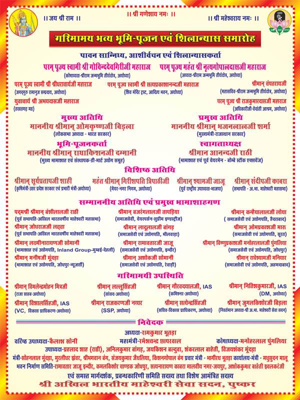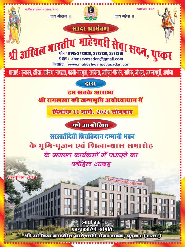 दिनांक 4.2.2024 को श्री अखिल भारतीय माहेश्वरी सेवा सदन, पुष्कर की प्रबन्धकारिणी समिति की सेमी-वर्चुअल बैठक अध्यक्ष श्री रामकुमार भूतड़ा की अध्यक्षता में सानन्द सम्पन्न हुई। बैठक में वरिष्ठ उपाध्यक्ष श्री कैलाश सोनी जयपुर, उपाध्यक्ष श्री जयकिशन बल्दुवा ब्यावर, श्री विजयशंकर मून्दड़ा सरवाड़, महामंत्री श्री रमेशचन्द्र छापरवाल मकराना, कोषाध्यक्ष श्री मनोहरलाल पुंगलिया जोधपुर, कार्यालय मंत्री श्री मधुसुदन मालू पुष्कर, कार्यकारिणी समिति के सदस्य श्री सम्पत बिड़ला, श्री माणक दरक मेड़तासिटी, श्री कृष्णअवतार भंसाली, श्री सत्यनारायण काबरा जयपुर, श्री जगदीश लोहिया किशनगढ़ सहित विशेष आमंत्रित सदस्य श्री अशोक जैथलिया, श्री अशोक मालानी अजमेर, श्री ओमप्रकाश तापडिय़ा दिल्ली, श्री शंकरलाल करवा जयपुर, श्री किशन बंग किशनगढ़ आदि मुख्यालय में उपस्थित रहे एवं देशभर से काफी सदस्यगण वर्चुअल माध्यम से जुड़े। बैठक में विषय-सूची अनुसार सार्थक चर्चा एवं निर्णय हुए। प्रारम्भ में अध्यक्ष श्री रामकुमार भूतड़ा ने श्री रामलला की जन्मभूमि अयोध्या में सेवा-सदन द्वारा क्रय किये गये भूखण्ड के बारे में विस्तार से जानकारी दी एवं आगामी 11 मार्च, 2024 को भवन निर्माण हेतु भूमि-पूजन एवं शिलान्यास समारोह रखने की जानकारी प्रदान की। श्री भूतड़ा ने बताया कि भूमि-पूजन एवं शिलान्यास समारोह में राष्ट्रीय संत श्री गोविन्ददेवगिरी महाराज, लोकसभाध्यक्ष श्री ओमकृष्ण बिड़ला, राजस्थान के मुख्यमंत्री श्री भजनलाल शर्मा, प्रमुख भामाशाह श्री राधाकिशन दम्मानी ने पधारने की स्वीकृति प्रदान कर दी है। शेष संत-महात्माओं एवं वरिष्ठ समाजबन्धुओं की समुपस्थिति में समारोह आयोजित किया जाना निश्चित है। जिस पर सभी उपस्थितजन ने करतल ध्वनि से हर्ष प्रकट किया। उपस्थित सदस्यों ने कार्यक्रम आयोजन हेतु विभिन्न सुझाव दिये। विस्तृत चर्चा के पश्चात उपरोक्त आयोजन के सफलतम आयोजन हेतु कार्यभार बांटने के लिये विभिन्न समितियों का गठन भी किया गया। घोषणा की। अन्त में महामंत्री ने सभी का आभार प्रकट करते हुए बैठक समाप्ति की घोषणा की।