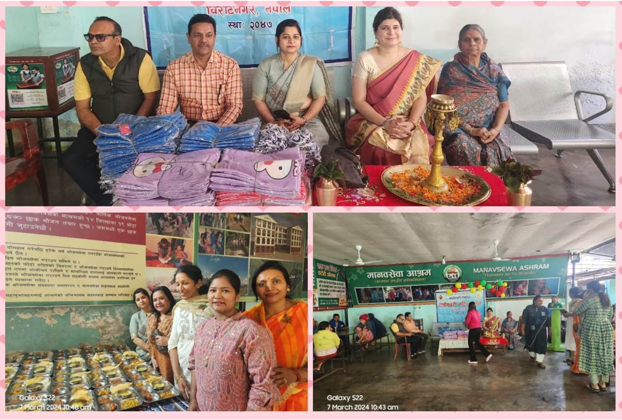 अंतराराष्ट्रीय महिला दिवस के उपलक्ष में माहेश्वरी महिला मंच विराटनगर द्वारा मानव सेवा आश्रम विराटनगर में 70 सदस्यों को मंच द्वारा भोजन तथा नए वस्त्र प्रदान किया गया। मंच की संस्थापक अध्यक्ष श्रीमती गोमती राठी, अखिल भारतवर्षीय माहेश्वरी महिला संगठन पूर्वांचल की उपाध्यक्ष श्रीमती गिरिजा शारदा, माहेश्वरी समाज बिराटनगर के निवर्तमान अध्यक्ष श्री आनंद मारू, मारवाड़ी महिला मंच विराटनगर की अध्यक्ष श्रीमती अमिता पेड़ीवाल, समाज के गणमान्य अमिताभ गट्टानी, लहन से पधारे माता श्रीमती भगवती सारदा साथ मंच की बहिनों की उपस्थिति काफी सराहनीय रही। इस कार्यक्रम की संयोजिका मंच की सदस्य श्रीमती सरिता राठी थी।