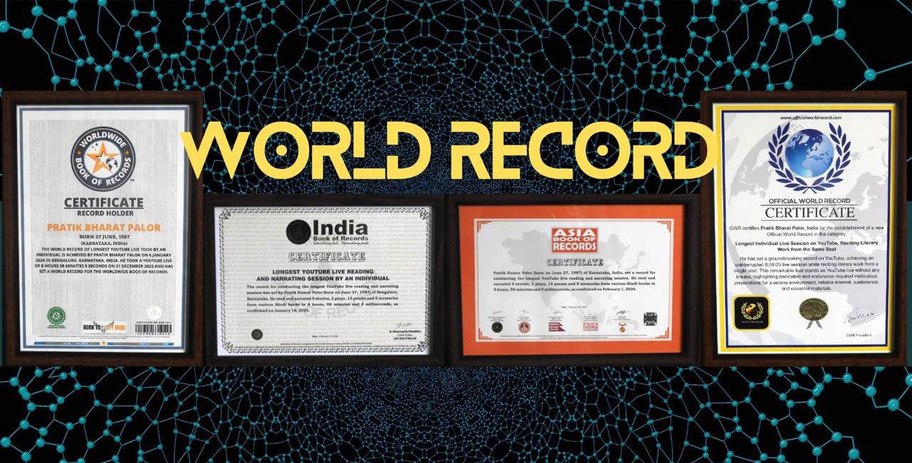 बेंगलुरु से प्रतीक भारत पलोड़ ने वो कर दिखाया जिसकी अभी तक किसी ने कल्पना भी नहीं कि थी। उन्होंने यूट्यूब पर सबसे लम्बा व्यक्तिगत लाइव सत्र बना कर विश्व-कीर्तिमान स्थापित किया है। प्रतीक ने एक ही आसन पर बैठे हुए निरन्तर नौ घण्टों तक अपनी ही मौलिक साहित्यिक रचनाओं (कविता, कहानी, आलेख, नाटक) का वाचन किया। ये उपलब्धि उन्होंने 31 दिसम्बर 2023 को प्राप्त की, जिसके आधिकारिक प्रमाण-पत्र उन्हें मार्च 2024 में मिले। ऑफिसियल वल्र्ड रिकॉर्ड, वल्र्डडवाइड बुक ऑफ रिकार्ड्स, एशिया बुक ऑफ रिकार्ड्स तथा इंडिया बुक ऑफ रिकार्ड्स ने उनकी इस उपलब्धि को प्रमाणित किया है और सराहा भी है। प्रतीक के कथनानुसार इस उपलब्धि के पीछे डेढ़ वर्ष का विचार, तैयारी और दो असफल प्रयास भी थे। अब वे गिनीज बुक ऑफ वल्र्ड रिकार्ड्स में भी स्थान पाने की प्रतीक्षा कर रहे हैं। उन्हें पूर्ण विश्वास है कि उनका ये कीर्तिमान भविष्य में वे स्वयं ही तोड़ेंगे।