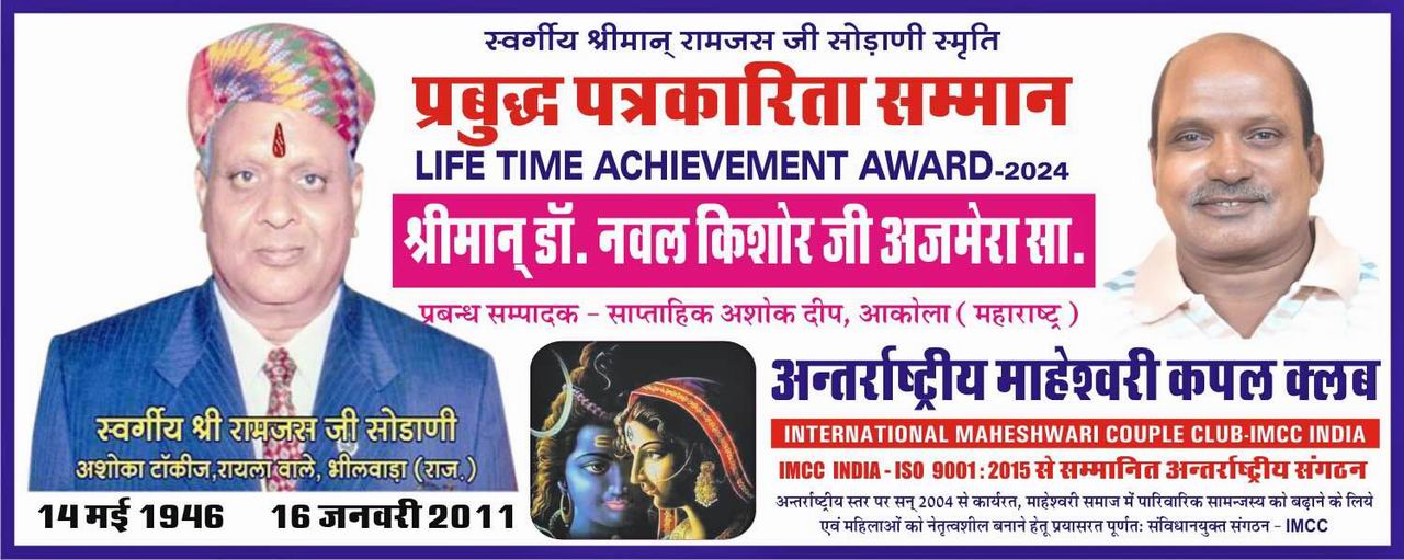 आकोला महाराष्ट्र के डॉ. श्री नवलकिशोर अजमेरा को राष्ट्रीय स्तर का पुरस्कार स्वर्गीय रामजस सोडाणी स्मृति जर्नलिस्ट ऑफ द ईयर अवार्ड - प्रबुद्ध पत्रकारिता सम्मान 2024 भेंट