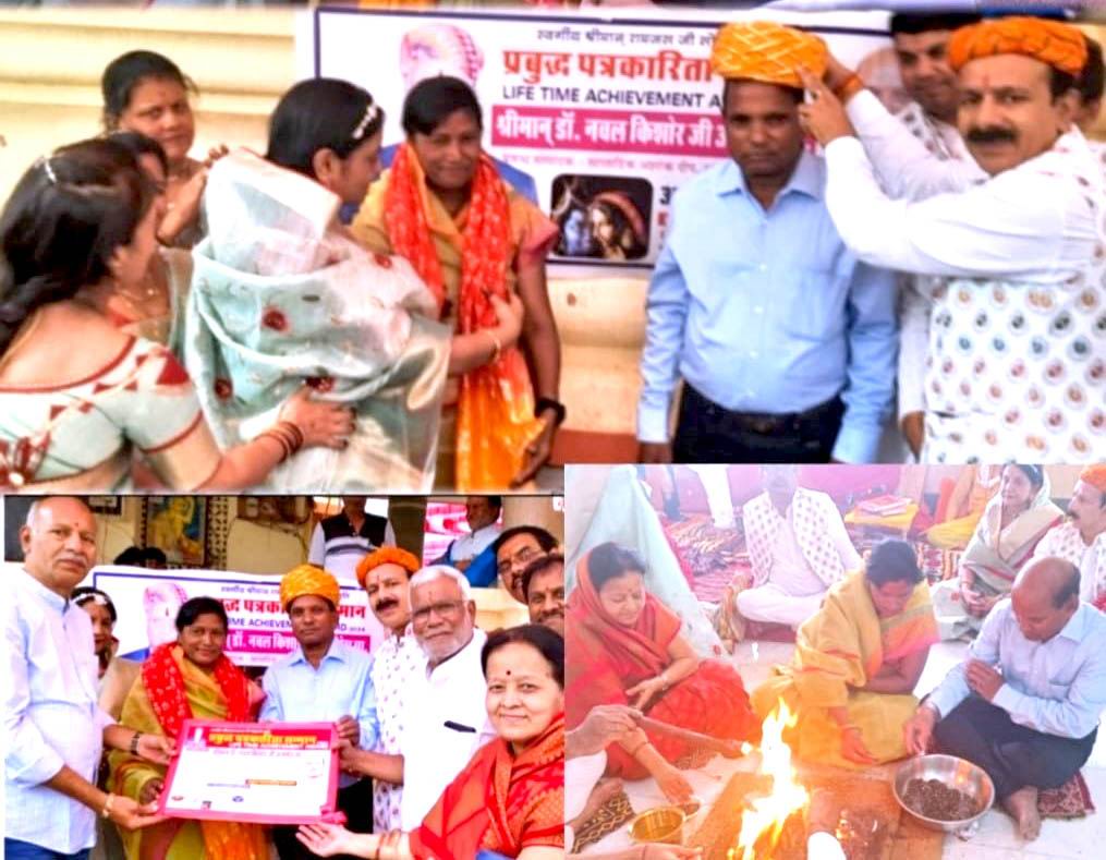 भीलवाडा से पगडी, उपरना, प्रमाण पत्र एवं 1100/-नगद पुरस्कार स्वरूप में अकोला शाखा को भेजा गया। अंतरराष्ट्रीय माहेश्वरी कपल क्लब शाखा अकोला की ओर से बिरला राम मंदिर में 6 अप्रैल 2024 को अखंड रामायण पाठ का आयोजन करके, दुसरे दिन 7 अप्रैल 2024 को सुबह होम हवन आरती के पश्चात IMCC के अकोला जिल्हाध्यक्ष सौ. मोनिका एवं गिरिष तोषनीवाल द्वारा डॉ.नवलकिशोर अजमेरा को पगडी एवं सौ. संगीता अजमेरा को उपरना ओढाकर सम्मानित किया गया। सतीश तोषनीवाल एवं डॉ. चंद्रकांत पनपालिया द्वारा प्रमाण पत्र देकर नवाजा गया। IMCC अकोला शाखा के संस्थापक अध्यक्ष, महाराष्ट्र प्रदेश संगठन के सचिव सौ. कांचन एवं सुनील नावंधर द्वारा 1100 /- रु. नगदी पुरस्कार देकर पुरस्कृत किया गया। डॉ. नवलकिशोर अजमेरा अकोला जिल्हा माहेश्वरी संगठन के सदस्य, अंतरराष्ट्रीय द्वारिका रणुजा रुणीचा संगम संस्थान ट्रस्ट, बीकानेर राजस्थान संस्था के महाराष्ट्र प्रदेश के प्रचार प्रसार मंत्री तथा अन्य कई संगठनों में सक्रिय कार्यरत है। इस अवसर पर IMCC शाखा अकोला के पदाधिकारी, कार्यकारिणी सदस्या, माहेश्वरी समाज के गणमान्य लोग प्रमुखता से उपस्थित थे। डॉ. नवलकिशोर अजमेरा को मिले इस सम्मान के लिए चहु और से बधाईयां मिल रही हैं।