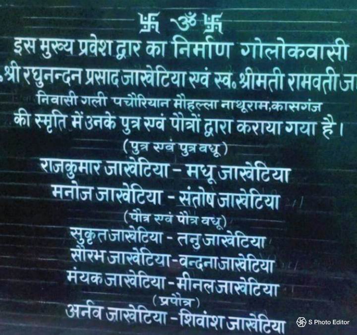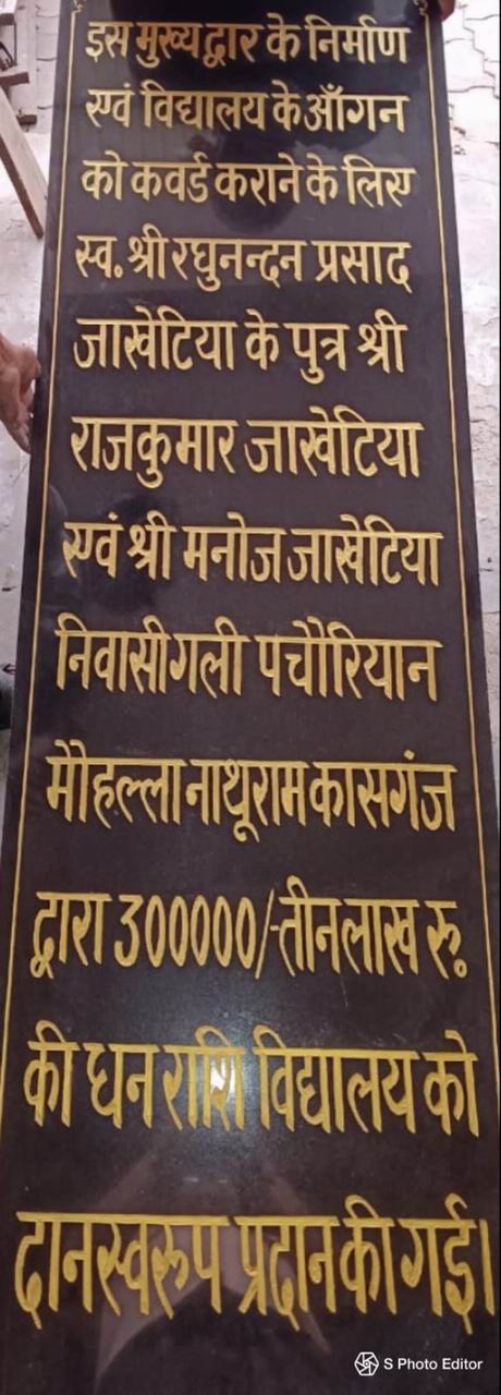 राजकुमार जाखेटिया एवं मनोज जाखेटिया कासगंज ने डीडू माहेश्वरी युवक मंडल रजि. कासगंज के अंतर्गत गौरीशंकर शारडा जूनियर हाई स्कूल में 300000 रुपए में गेट एवं ग्राउंड कवर करने के लिए स्व. श्वी रघुनंदन प्रसाद जाखेटिया एवं स्व श्रीमती रामवती जाखेटिया माता-पिता की स्मृति मे दान दिए है। समाज बन्धुओ ने हर्ष व्यक्त किया है। महेंद्र चांडक, घनश्याम मुना, कमल चाडंक, राजेश्वर प्रसाद, शेष काबरा, समाज के अध्यक्ष अरविंद काबरा, मंत्री सुनील दरक, प्रबंधक राजीव काबरा, सच्चिदानंद डांगरा, हिरदेश करवा, माधव माहेश्वरी, अनिल माहेश्वरी, विनय माहेश्वरी, अनुराग माहेश्वरी, दुर्गेश माहेश्वरी, सुरेंद्र माहेश्वरी एवं पश्चिमी उत्तर प्रदेश के अध्यक्ष राकेश मोहता व मंत्री सुभाष चंद्र बाहेती, कोषाध्यक्ष नवनीत माहेश्वरी, अखिल भागां, रामकुमार सडानी, रघुवंश राठी, संजीव गोदानी, अखिल भारतीय महासभा के उत्तराचंल के उपाध्यक्ष श्री विनीत केला, महिला समिति की अध्यक्ष श्रीमती अलका माहेश्वरी, मत्री श्रीमती नीलम पल्तानी ने समाजसेवी राजकुमार जाखेटिया, मनोज जाखेटिया को बधाई एवं शुभकामनाएं दी हैं एवं उज्जवल भविष्य की कामना की है।