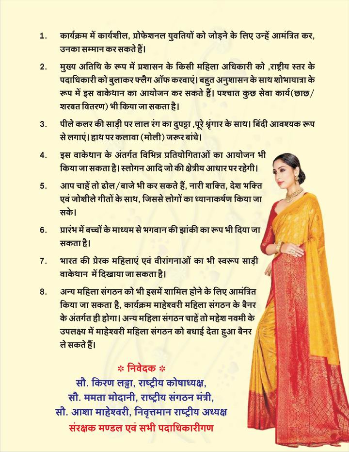 महेश नवमी के उपलक्ष में राष्ट्रीय महिला संगठन द्वारा पारंपरिक परिधान एवं संस्कृति संवर्धन हेतु साड़ी वाकेंथान कार्यक्रम का 8 जून 2024 को वृहद आयोजन किया जा रहा है। हमारे व्यक्तित्व को एवं परम्परा को कैसे निखारा जा सकता है, यही संदेश देता अष्टसिद्धा एवं संस्कृति सिद्धा समितियों के संयुक्त तत्वावधान में कार्यक्रम आयोजित किया जा रहा है। महेश नवमी के उपलक्ष्य में इस कार्यक्रम का आयोजन सभी प्रदेश, जिले एवं स्थानीय संगठन द्वारा 8 जून शनिवार को आयोजित किया जाना है। सुबह 6.30 बजे से 10.00 बजे के बीच किसी भी केंद्रीय स्थल से समीपस्थ मंदिर तक सभी महिलाएं एवं युवतियां साड़ी पहन कर, एक जैसे ड्रेसकोड को फॉलो कर (अपनी रचनात्मकता का पूर्ण परिचय दें)। साथ ही मंदिर में वेशभूषा सबंधित एक बोर्ड लगाना है। मंदिर के लिए बोर्ड का डिजाइन अखिल भारतवर्षीय माहेश्वरी महिला संगठन द्वारा भेजा जाएगा।