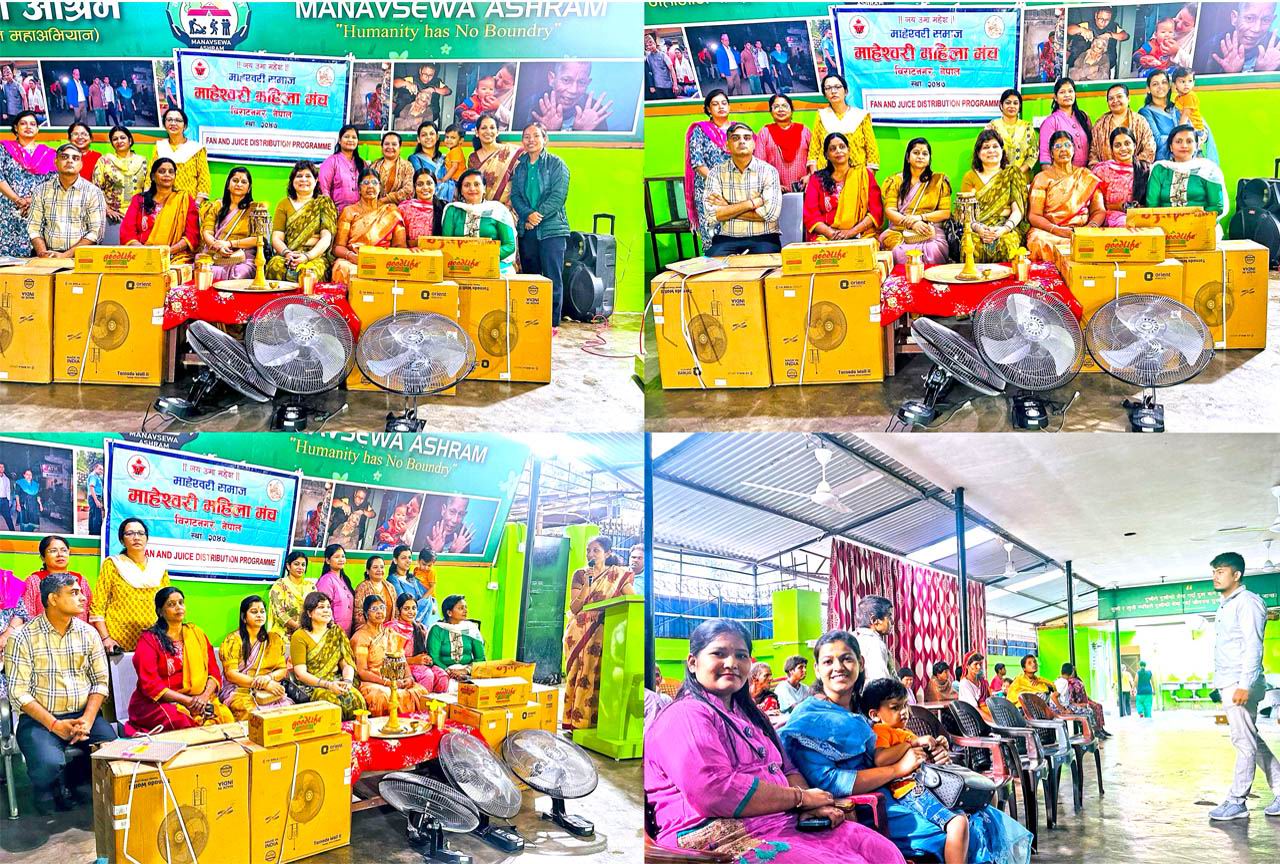 गर्मी से निजात पाने के लिए माहेश्वरी महिला मंच विराटनगर द्वारा 9 मई 2024 शाम 4.00 बजे मानव सेवा आश्रम टिंटोलिया में 10 पंखे लगवाए गए तथा आश्रम वासियों को जूस का वितरण किया गया। अखिल भारतवर्षीय माहेश्वरी महिला संगठन पूर्वांचल उपाध्यक्ष श्रीमती गिरिजा शारदा, नेपाल राष्ट्रीय माहेश्वरी महिला संगठन उपाध्यक्ष श्रीमती अमिता पेड़ीवाल, माहेश्वरी युवा मंच विराटनगर अध्यक्ष श्री अजय राठी, मंच की पूर्व अध्यक्ष श्रीमती सुशीला पेड़ीवाल के साथ के साथ मंच की बहनों की उपस्थिति रही। इस कार्यक्रम की संयोजिका श्रीमती पूजा सदानी थी।