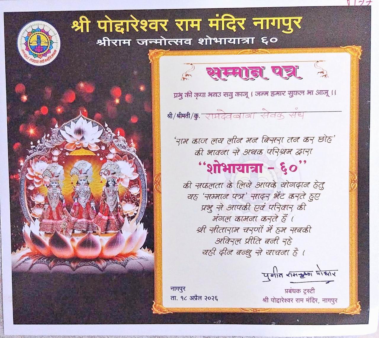 नागपुर में श्रीराम जन्मोत्सव शोभा यात्रा के साठवें वर्ष पर भव्य आयोजन, सेवक संघ सम्मानित
