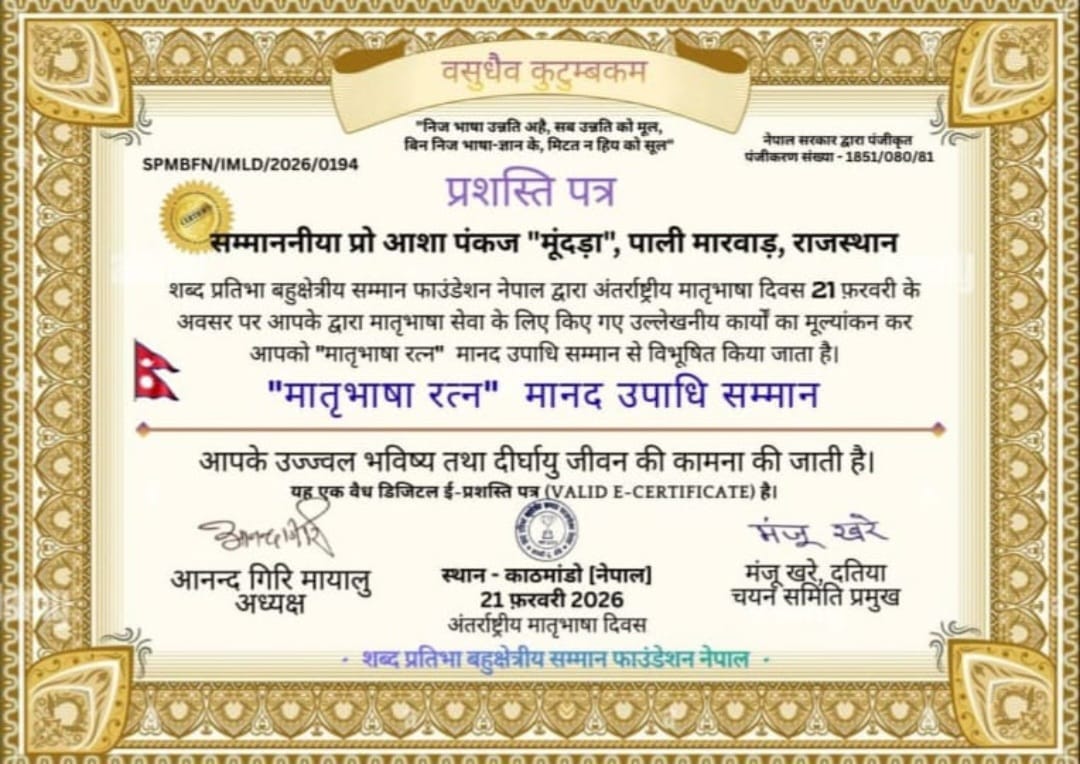नेपाल की प्रसिद्ध संस्था शब्द प्रतिभा बहुक्षेत्रीय सम्मान फाउन्डेशन नेपाल द्वारा आयोजित अंतर्राष्ट्रीय मातृभाषा दिवस के उपलक्ष्य में उत्कृष्ट साहित्यकार के रूप में पाली की ख्याति प्राप्त कवयित्री तथा वरिष्ठ साहित्यकार प्रो.आशा पंकज मूँदडा को मातृभाषा रत्न की मानद उपाधि सम्मान से प्रशस्ति पत्र प्रदान कर सम्मानित किया गया है। ज्ञात हो कि प्रो.आशा पंकज मूँदडा पाली राजकीय बांगड़ महाविद्यालय में सहायक प्रोफेसर के पद पर सेवाएं दे रही हैं। इनकी सैकड़ों रचनाएं देश-विदेश की विभिन्न पत्र-पत्रिकाओं में एवं सांझा संकलनों में प्रकाशित हो चुकी है तथा साहित्य के क्षेत्र में उल्लेखनीय योगदान के लिए दर्जनों प्रतिष्ठित सम्मान भी मिल चुके हैं। सम्मान ग्रहण करते हुए प्रो.आशा पंकज मूँदडा ने कहा - हम सभी कवि-कवयित्रियों की कविता का मूल्यांकन अंतर्राष्ट्रीय संस्था द्वारा होना गौरव का विषय है। शब्द प्रतिभा निष्ठा और लगन से देश-विदेश के कवि,लेखक और साहित्यकारों को प्रोत्साहित करने का कार्य करती आई है, जो प्रशंसनीय है। आयोजित प्रतियोगिता में देश-विदेश से हजारों प्रतिभागियों की सहभागिता थी, जिसमें से उत्कृष्ट साहित्य के आधार पर कवि-कवयित्रियों का चयन किया गया है। प्रो.आशा पंकज मूँदडा को सम्मानित करते हुए संस्था के अध्यक्ष आनन्द गिरि मायालु ने कहा - प्रो.आशा पंकज मूँदडा बहुआयामिक व्यक्तित्व की धनी लेखिका और कवयित्री हैं। इनके लेखन में एक सहजता-सरलता पाई गई है, समाज को रूपांतरण करने की क्षमता रखती हैं। वह गद्य तथा पद्य विद्या में समान रूप से सृजन करती आई है साथ ही वह एक सफल मंच संचालिका भी है,जो राष्ट्रीय स्तर पर मंचों का कुशल संचालन करती है। इनका काव्य संग्रह प्रियदर्शिनी भी प्रकाशित हो गया हैं। नेपाल से सम्मान की खबर पाकर प्रो.आशा पंकज मूँदडा के परिचितों ने शुभ कामनाएं प्रदान की हैं।